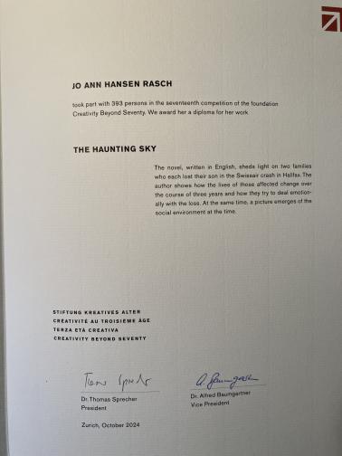 I believe my book, hopefully translated into German or French, has its place in Switzerland. Two years ago, I sent it off to Creativité au Troisième Age, a foundation based in Zurich, which accepts work in different languages from people aged over seventy. This summer I received a letter saying I had received a distinction. Wow, I thought. This distinction has given me the courage to send my manuscript off to a few editors here in Swiss romande. Who knows? Maybe for my eightieth birthday I will find a publisher for The Haunting Sky.